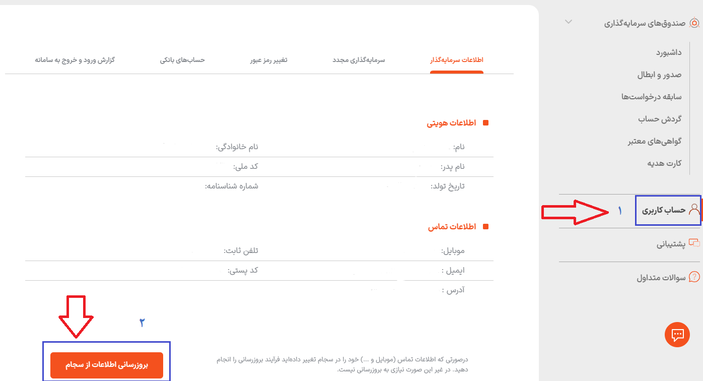 پس از اتمام بررسی و تغییرات، لازم است در سامانه Mibfunds.ir از بخش حساب کاربری بر روی گزینه بروز رسانی اطلاعات از سجام کلیک نمایید: